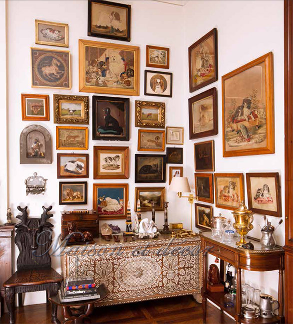 Un des murs de la bibliothèque est particulièrement chargé de tableaux de chiens. Lauren Bacall aimait énormément sa chienne papillon, Sophie, elle a eu à un moment plusieurs chiens. Sur le mur on voit des cockers, des épagneuls, des chiens généralement assis ou allongés sur un coussin, en peinture, en point de croix… et, dans le “coin toutou” – où se glissent quand même quelques chats et quelques lions – , une de mes pièces préférées de la vente, un superbe coffre syrien en bois incrusté de nacre.